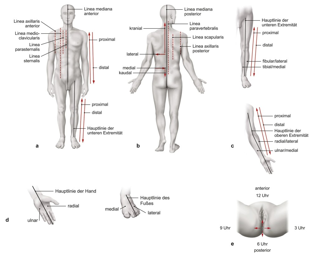 Anatomie lernen im Medizinstudium: Hier findest du eine Übersicht über die Orientierungslinien, Richtungs- und Lagebezeichnungen.