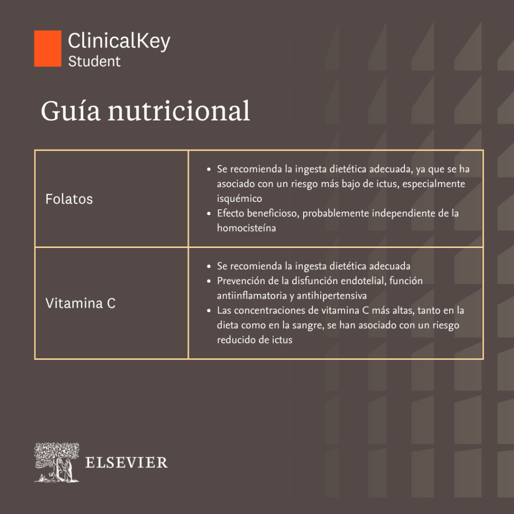 Se debe intentar mantener la salud global del paciente. Por ejemplo, los alimentos que sostienen la reparación celular y mejoran la respuesta de los marcadores inflamatorios son los frutos secos, los lácteos semidesnatados, los cereales integrales, y las frutas y verduras ricas en antioxidantes. En particular, en algunos estudios se ha demostrado que una dieta rica en ácidos grasos ω-3 tiene efecto protector frente al ictus, y las recomendaciones dietéticas actuales de comer pescado azul dos veces por semana ayudan a cubrir el objetivo de la ingesta de ω-3. Tenga en cuenta que los suplementos de ácidos grasos ω-3 no han demostrado el mismo beneficio y que están contraindicados en las personas que toman anticoagulantes o antiagregantes, como warfarina o ácido acetilsalicílico.