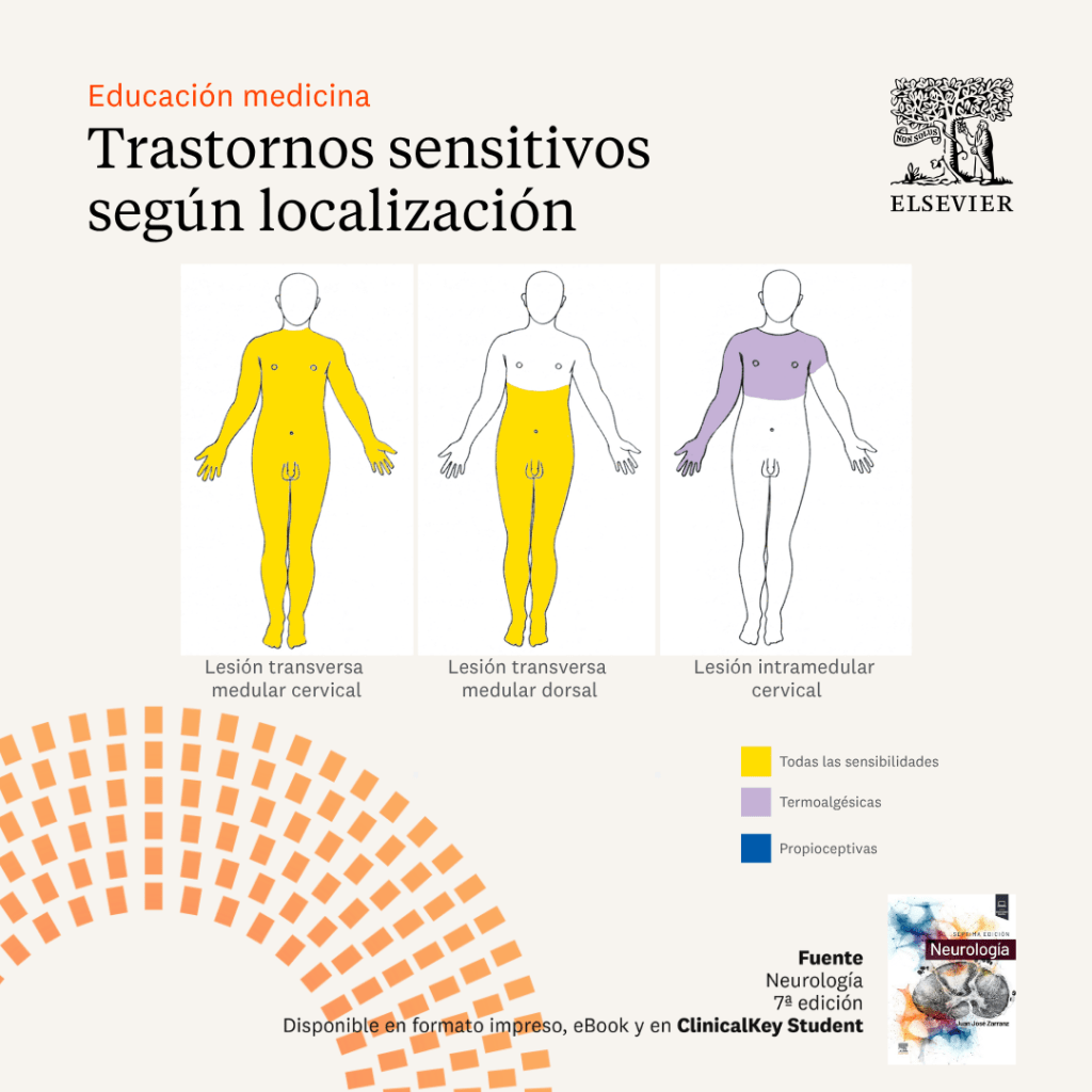 Infografías de los patrones de distribución y tipo de sensibilidad afectada en algunas de las lesiones más comunes de los sistemas nerviosos central y periférico. Los límites de los defectos están dibujados como nítidos, pero en realidad son difusos.