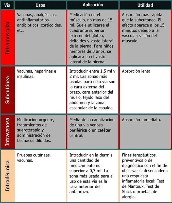 La vía parenteral es una de las formas de administración de fármacos más utilizadas por los profesionales sanitarios. Para aplicar un medicamento por esta vía será necesario atravesar la piel, de forma que la medicación llegue al torrente sanguíneo directamente o a través de los diferentes tejidos donde se administra. A la hora de aplicar un fármaco inyectable tenemos cuatro vías diferentes de administración: