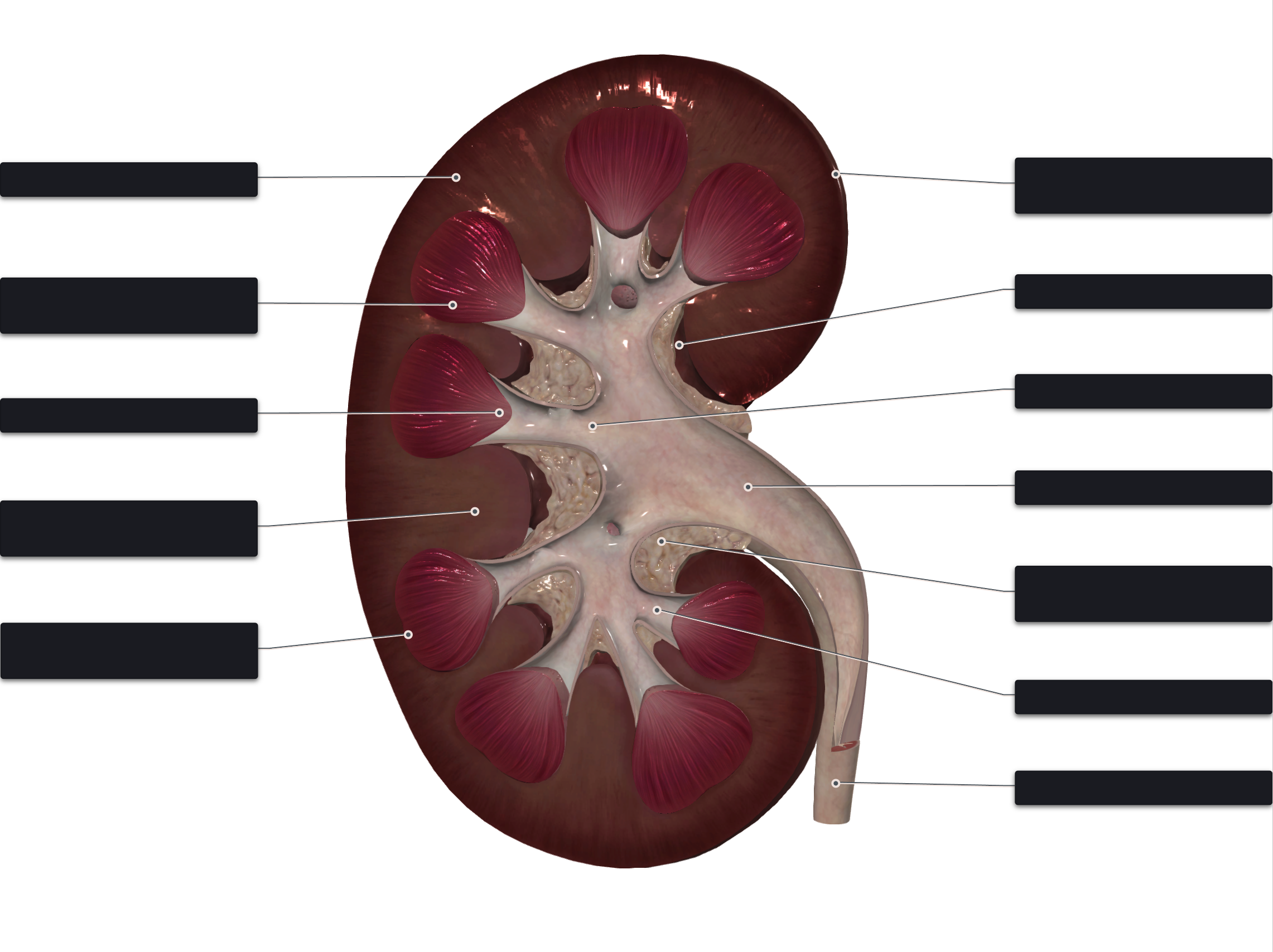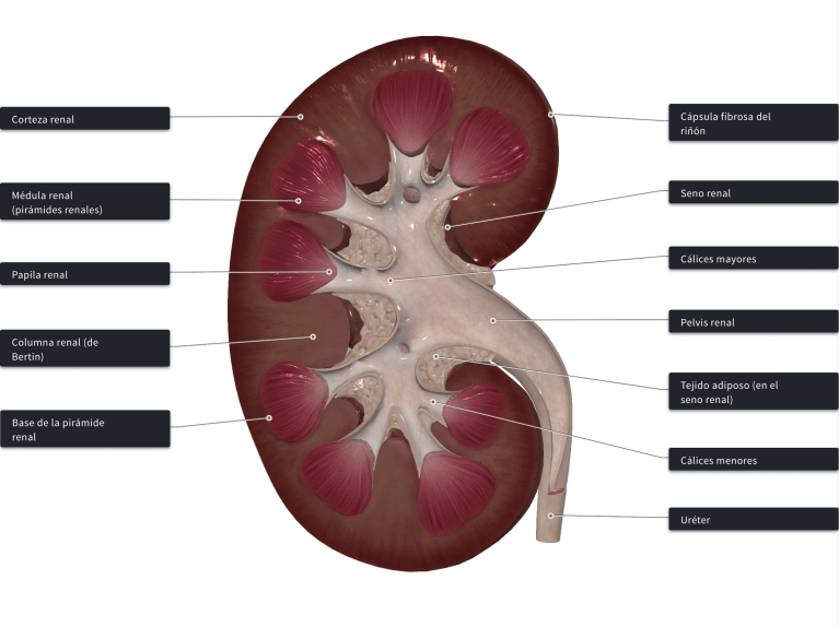 Flashcard de anatomia 3D: estructura macroscópica del riñón: riñón derecho seccionado.