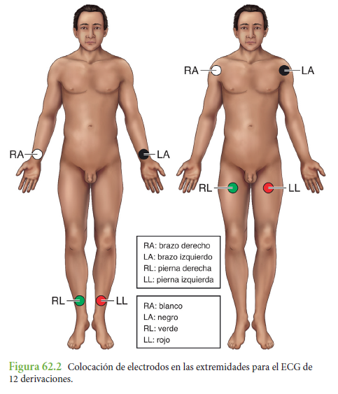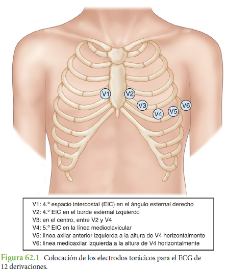 instantánea de las formas de onda desde 12 ángulos o vistas diferentes del corazón. Se coloca un electrodo en cada una de las cuatro extremidades y seis electrodos en lugares específicos del tórax, con un total de 10 electrodos en la piel del paciente. Se trata de las derivaciones bipolares I, II y III de las extremidades; las derivaciones aumentadas aVR, aVL y aVF de las extremidades, y las derivaciones precordiales V1 a V6 del tórax. Las derivaciones visualizan una parte específica de la superficie del corazón y ayudan a determinar qué parte del corazón ha sufrido o está sufriendo daños, así como el origen y el flujo del impulso eléctrico.